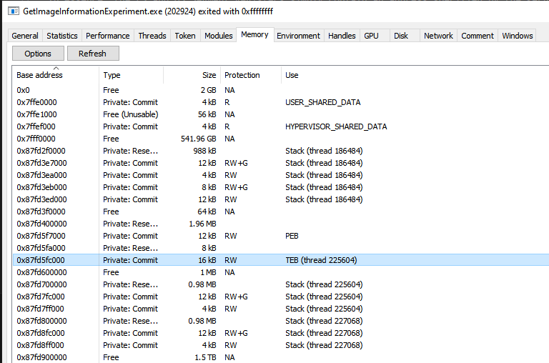 To locate the TEB in memory, we need to systematically examine the process's memory space. We can accomplish this using VirtualQuery (or VirtualQueryEx for other processes), a Windows API function that retrieves information about a region of memory. VirtualQuery acts like a memory inspector. You give it a memory address, and it returns details about that region: its size, protection level (read/write/execute permissions), state (committed, reserved, or free), and type (private, mapped, or image). Think of it as asking Windows, "What's at this address and what are its properties?"